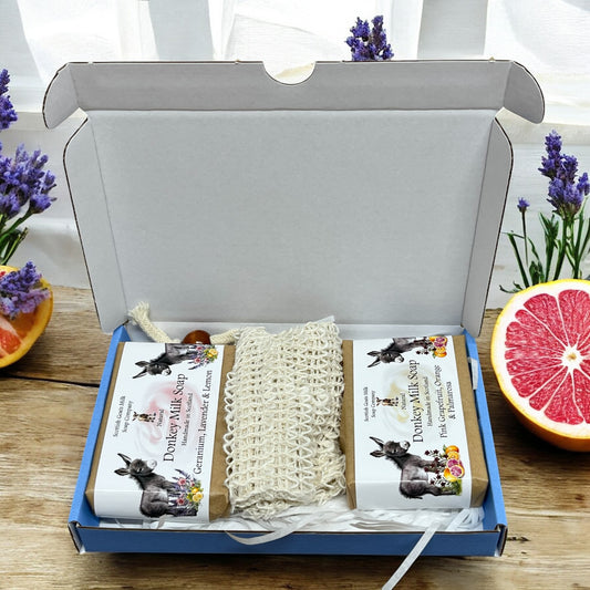 4 Essential Oil Donkey Milk Soap Bar & Soap Bag Gift Set | 3 Boxes to Choose From | Gift Boxed