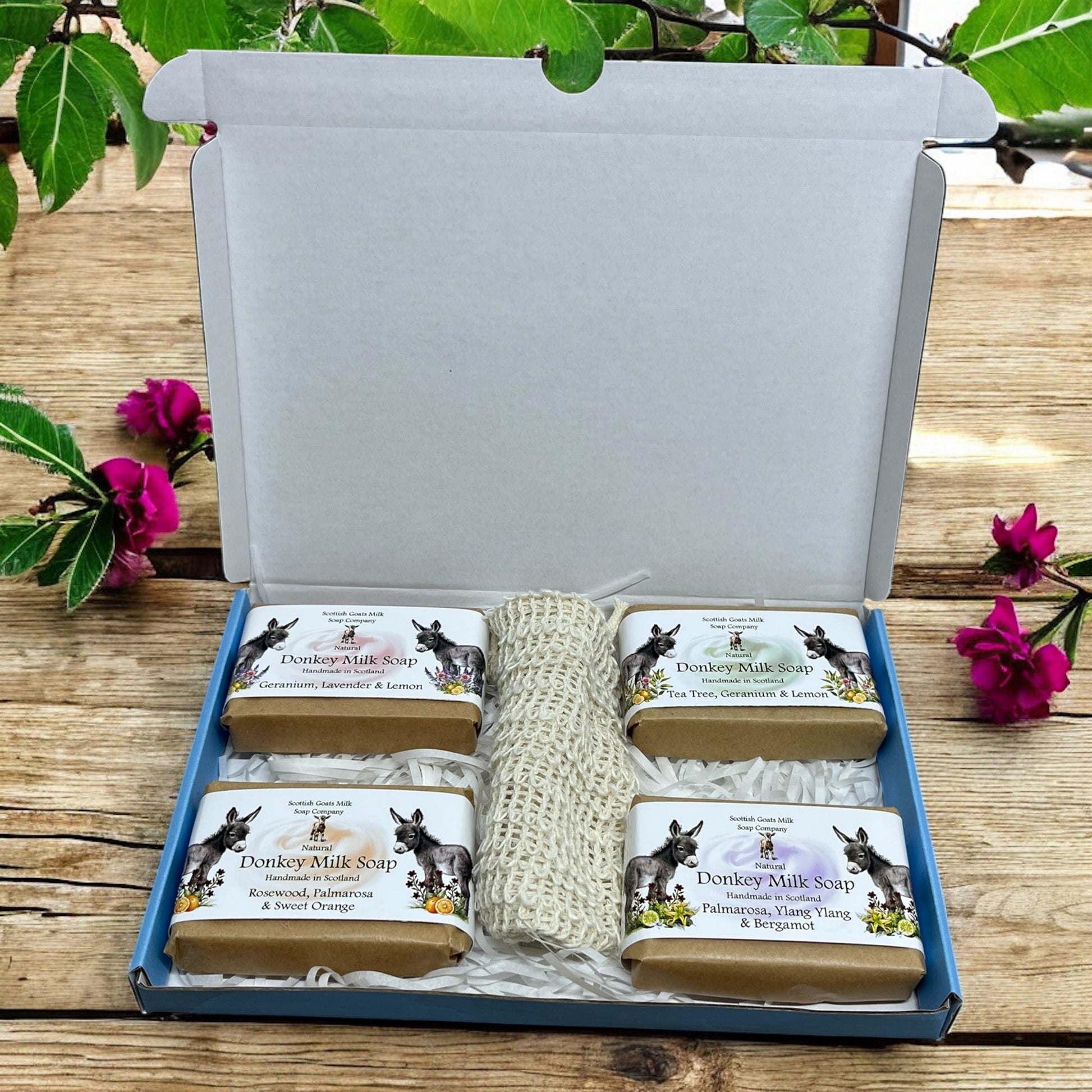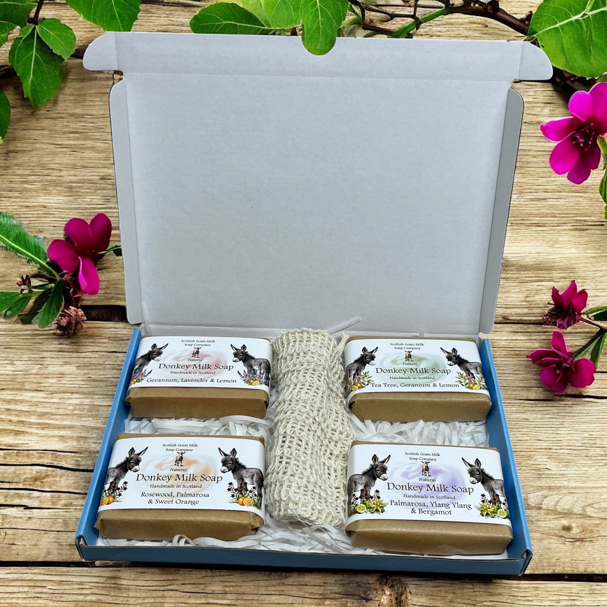 The eco-friendly gift boxes contain 4 varieties of our essential oil fragranced donkey milk soap bars together with a sisal exfoliating soap bag. Choose from 3 boxes each containing 4 full size soaps that compliment each other perfectly. The sisal soap bags are a lovely addition to the set. These little bags help make your soap last longer as you can hang them in your bathroom to air dry. They are the perfect soap saver too - all the little pieces of soap that you are left with can be popped into the bag together to be used.