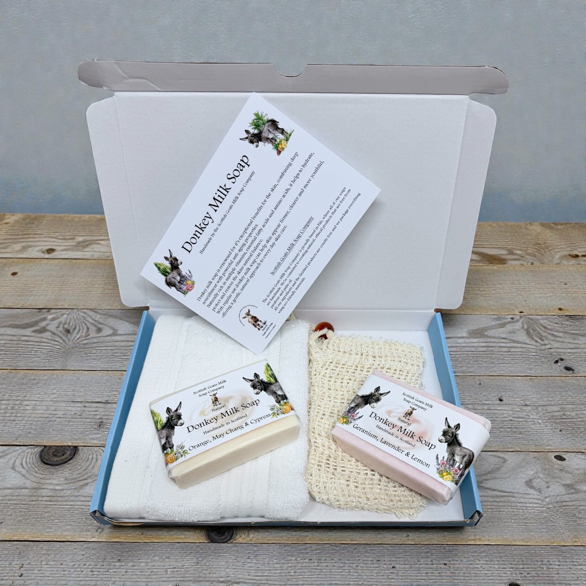 Each box contains two full-size bars of our handmade donkey milk soap, paired in complementary scents that work beautifully together. You’ll also find a super-soft bamboo face cloth and a natural sisal soap bag – perfect for gentle exfoliation, helping your soap last longer, and keeping everything neatly stored between uses.