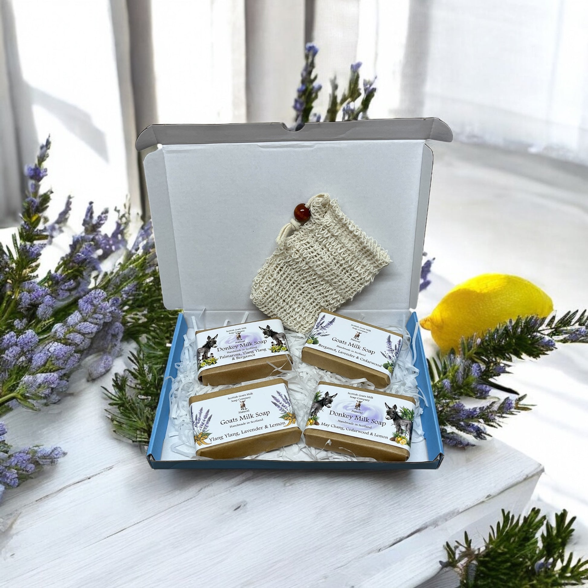 The eco-friendly gift boxes contain 2 varieties of our essential oil fragranced goats milk soap and 2 bars of our essential oil fragranced donkey milk soap bars together with a sisal exfoliating soap bag. Choose from 4 boxes each containing 4 full size soaps that compliment each other perfectly. The sisal soap bags are a lovely addition to the set. These little bags help make your soap last longer as you can hang them in your bathroom to air dry. They are the perfect soap saver too - all the little pieces of soap that you are left with can be popped into the bag together to be used.