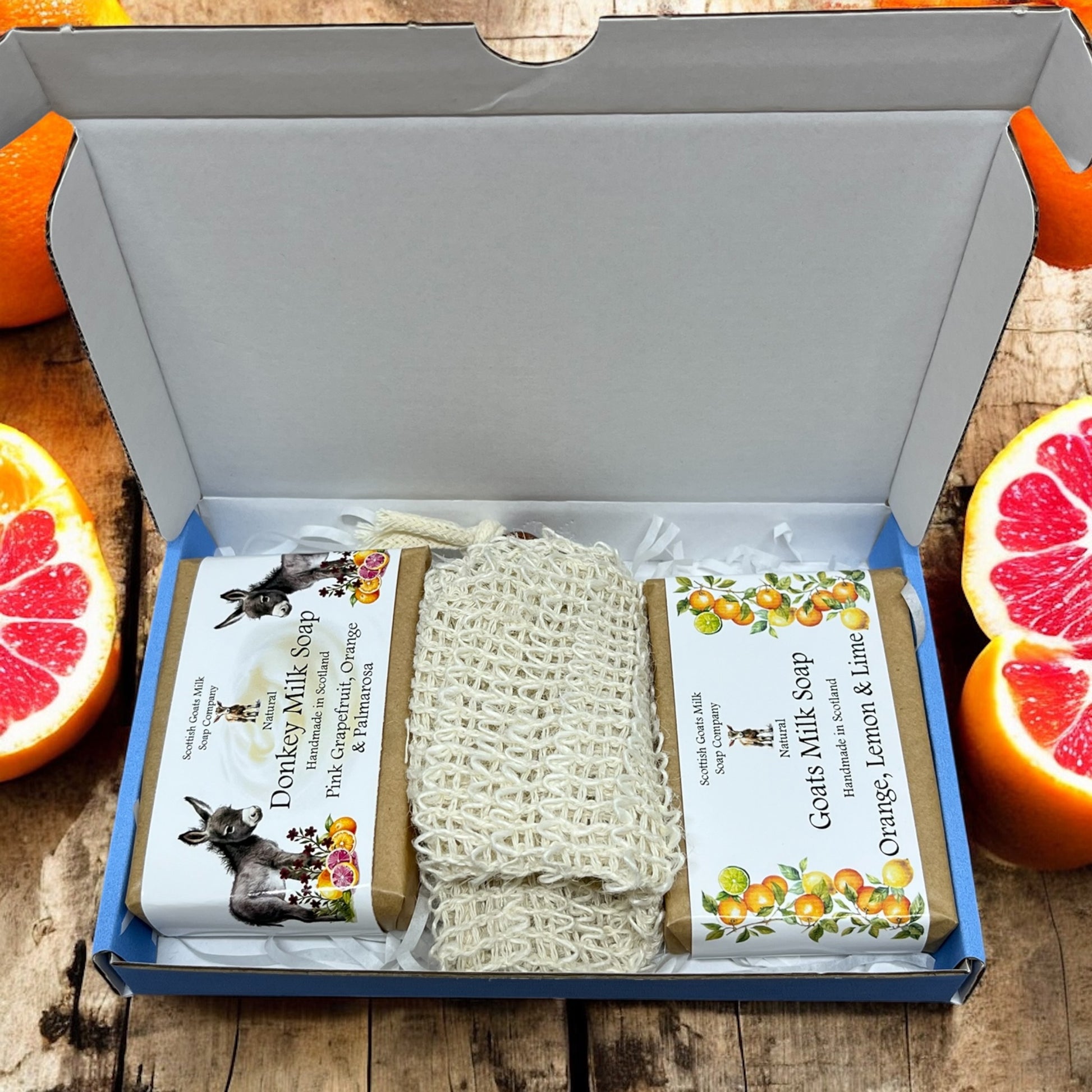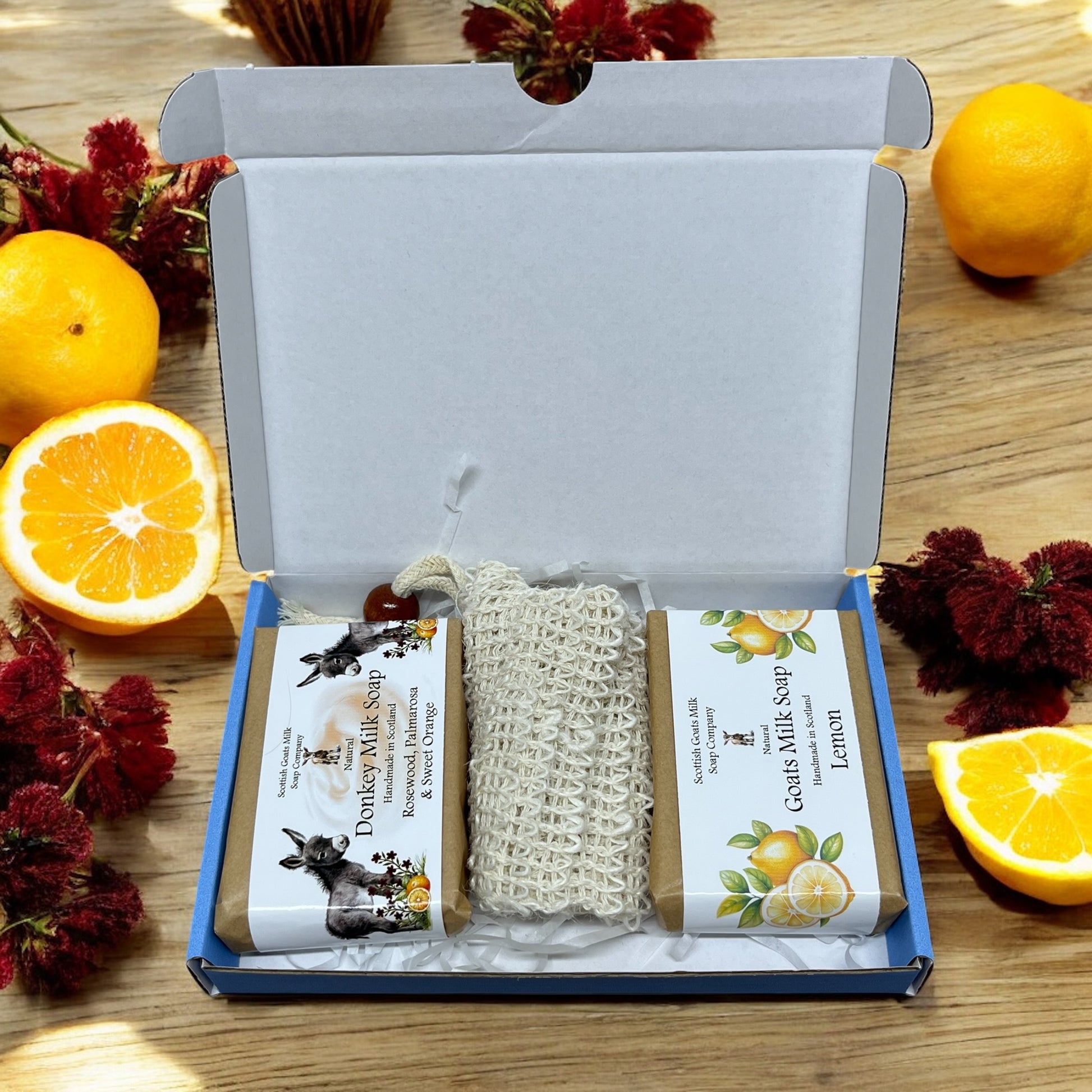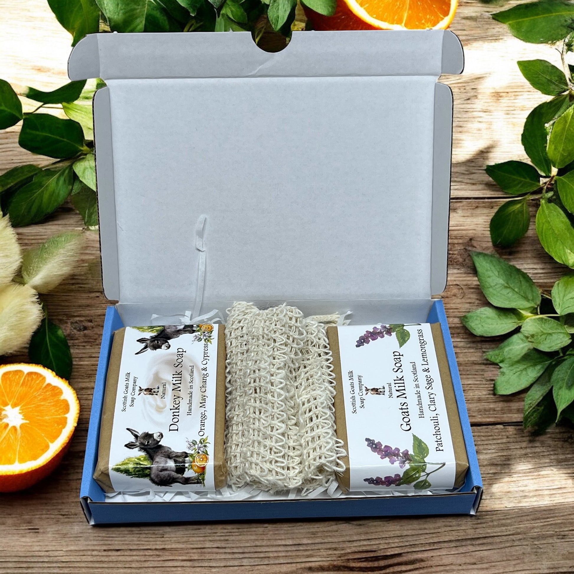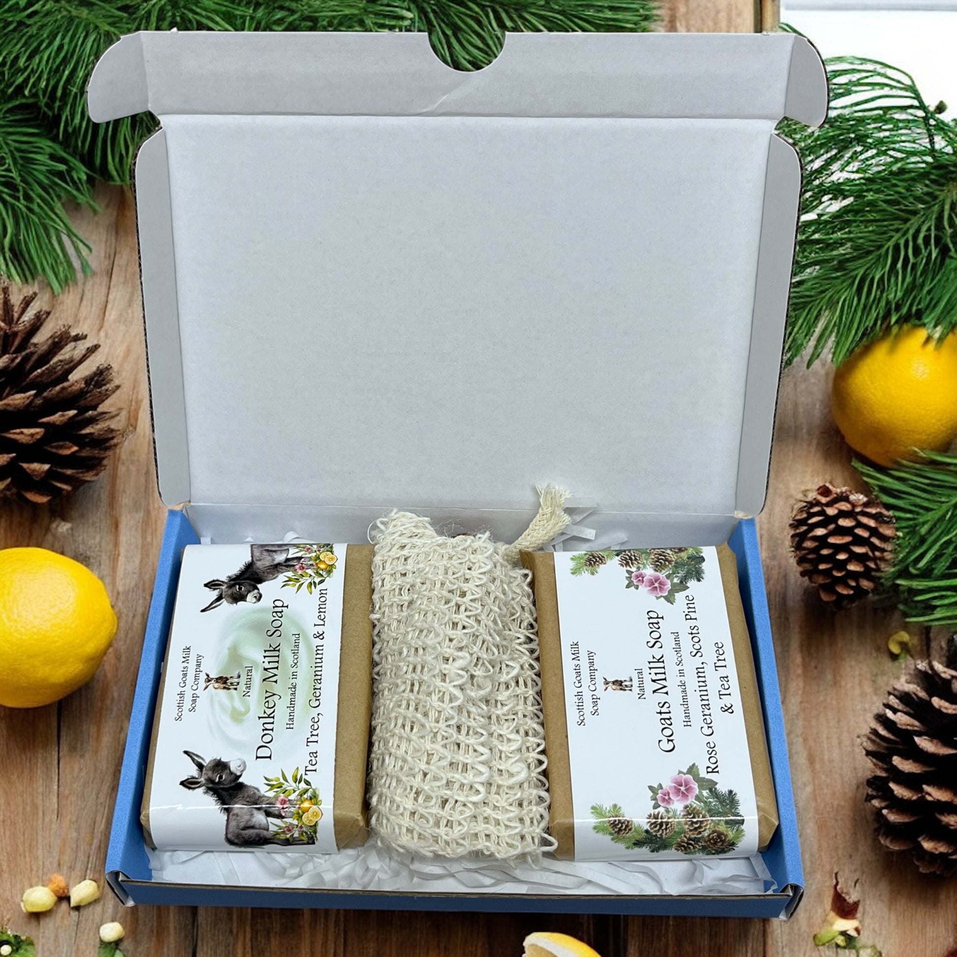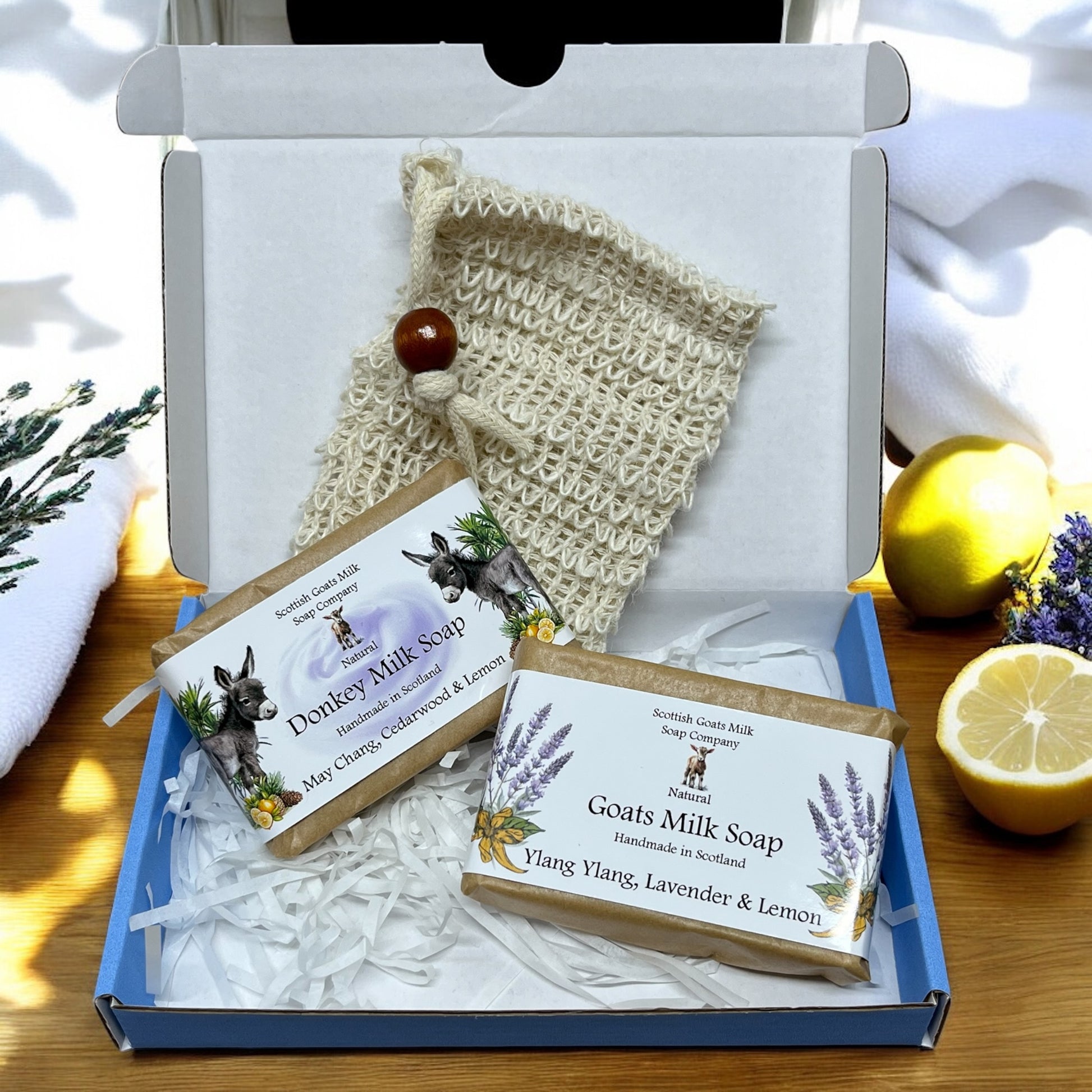 The eco-friendly gift boxes contain 2 varieties of our essential oil fragranced soap bars. 1 goats milk and 1 donkey milk, together with a sisal exfoliating soap bag. Choose from 8 boxes each containing 2 full size soaps that compliment each other perfectly. The sisal soap bags are a lovely addition to the set. These little bags help make your soap last longer as you can hang them in your bathroom to air dry. They are the perfect soap saver too - all the little pieces of soap that you are left with can be popped into the bag together to be used.