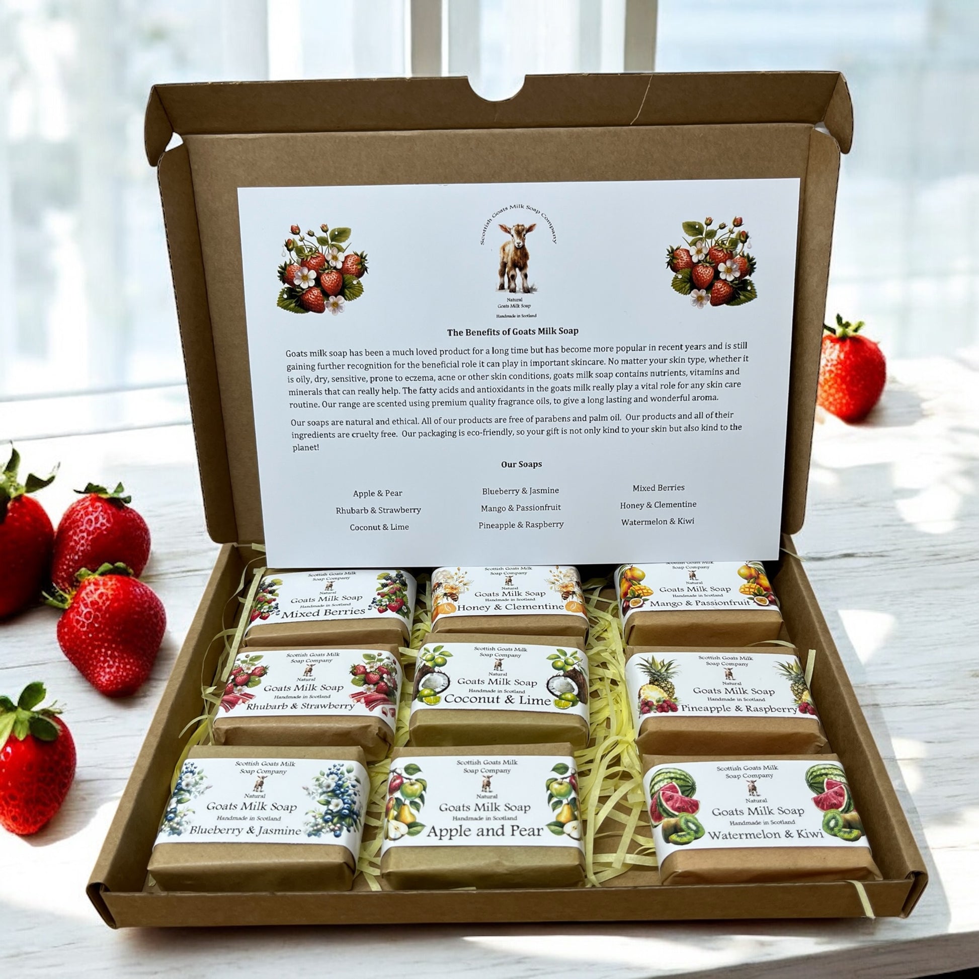The eco-friendly gift box contains all 9 varieties of our fruit scented soap bars in the perfect mini version of our full size bars. These fruit scented soaps are fragranced with premium oils giving them each their own wonderfully unique scent that lasts and is also gentle on your skin.