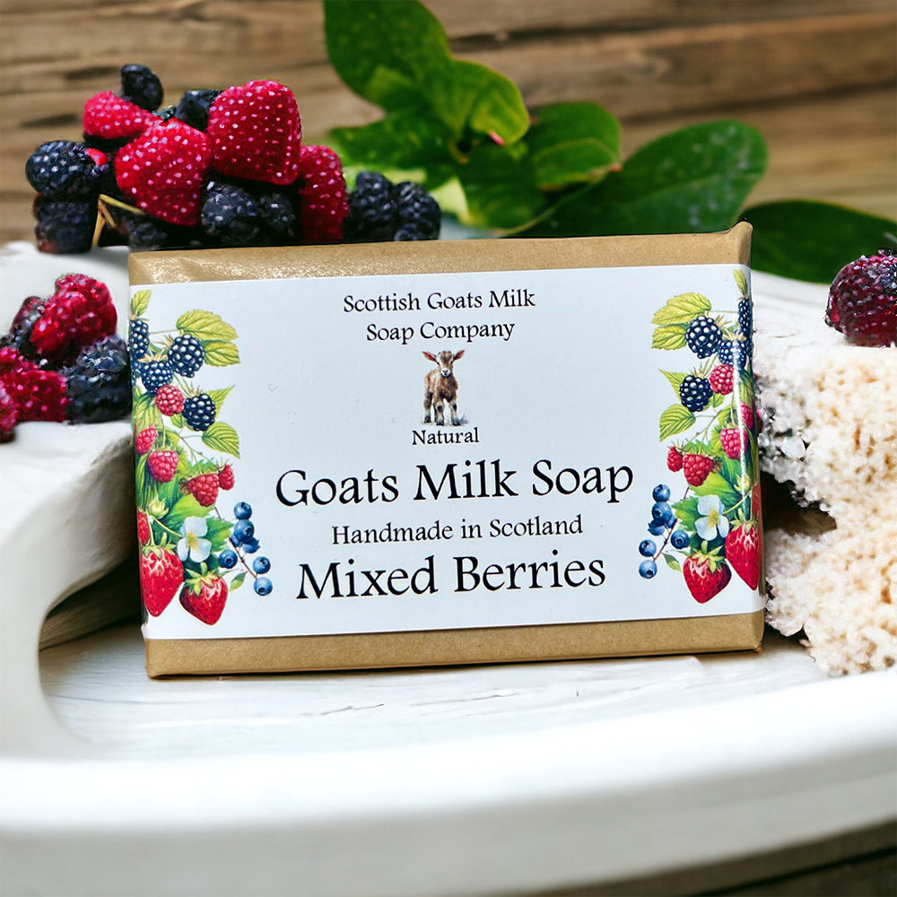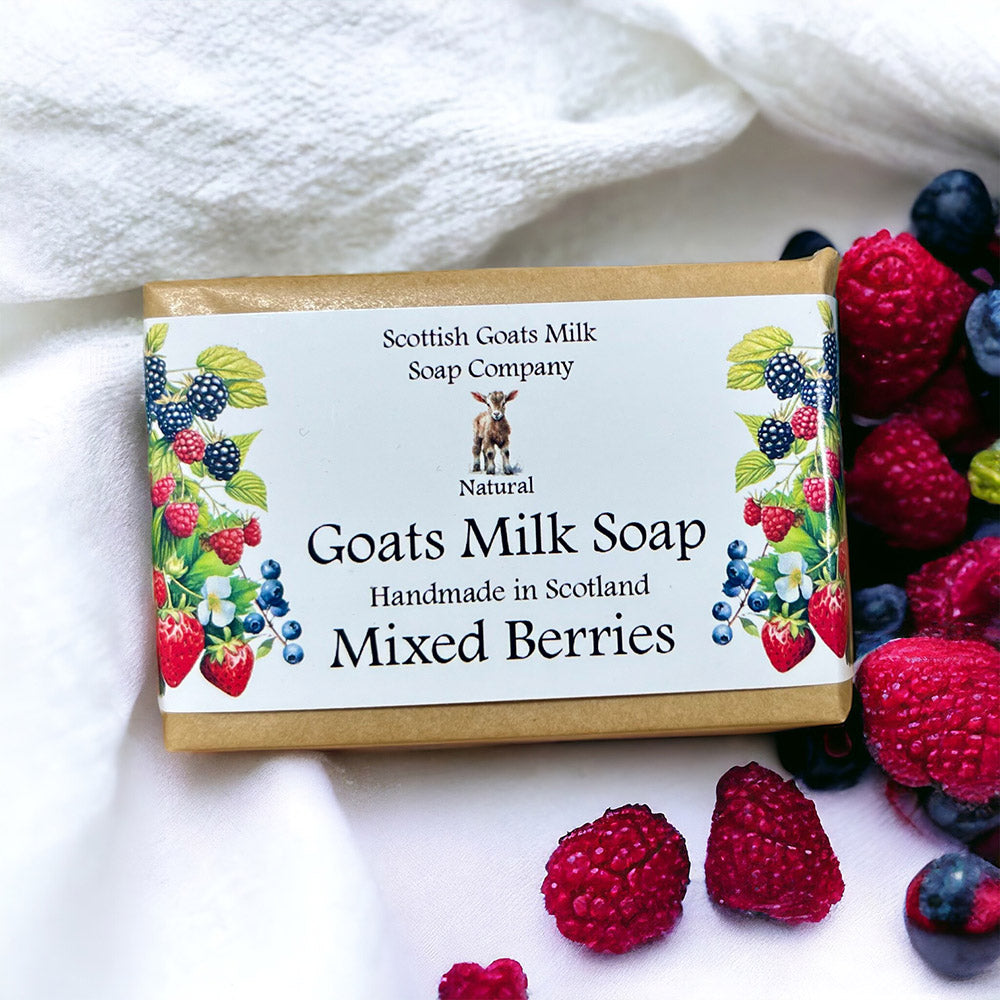 Enjoy the incredible fragrance of nature's finest berries with our Mixed Berries scented natural goat's milk soap bars. Handmade with care, these exquisite bars capture the essence of ripe strawberries, succulent raspberries, juicy blueberries and plump blackberries, creating an amazing fruity fragrance for you to love.
