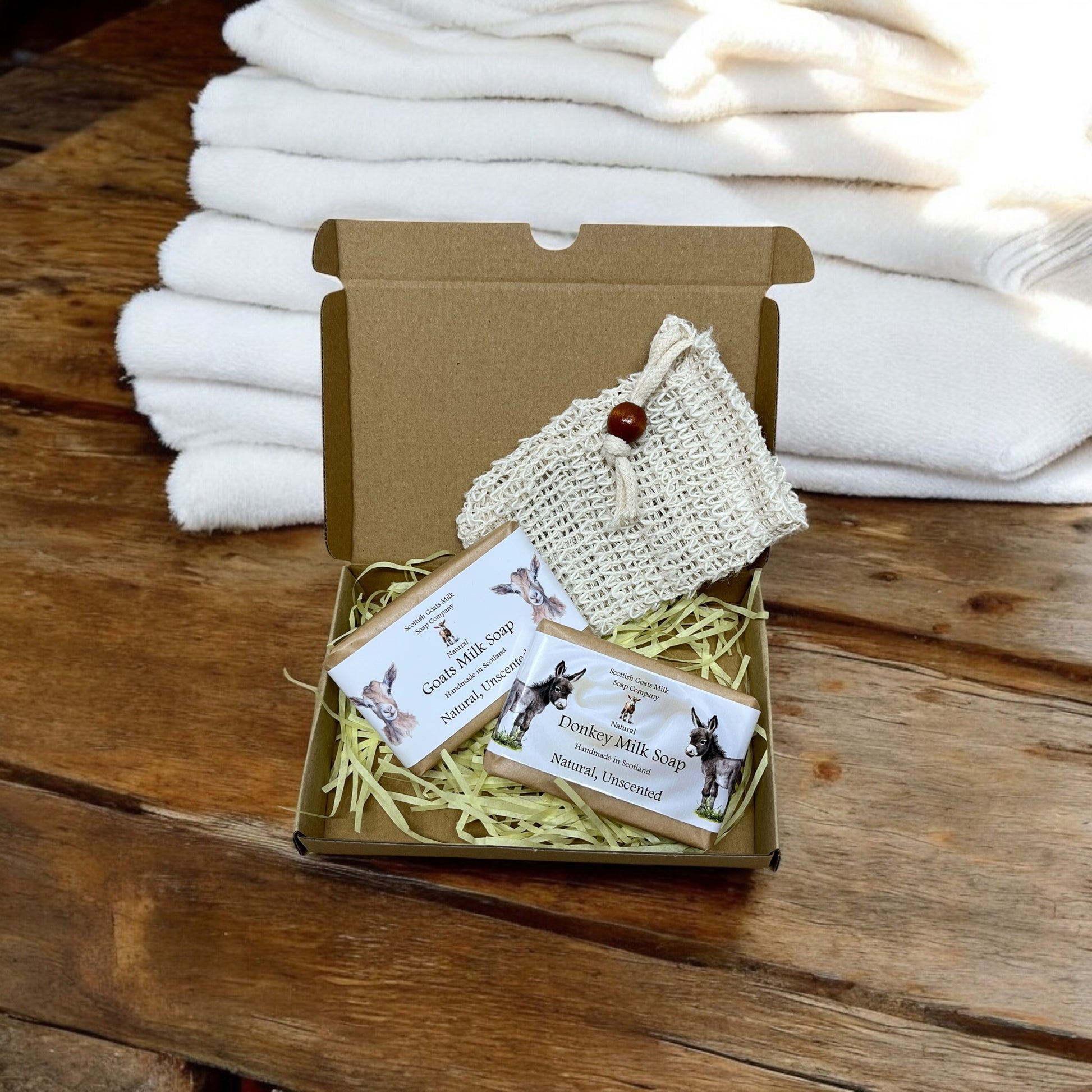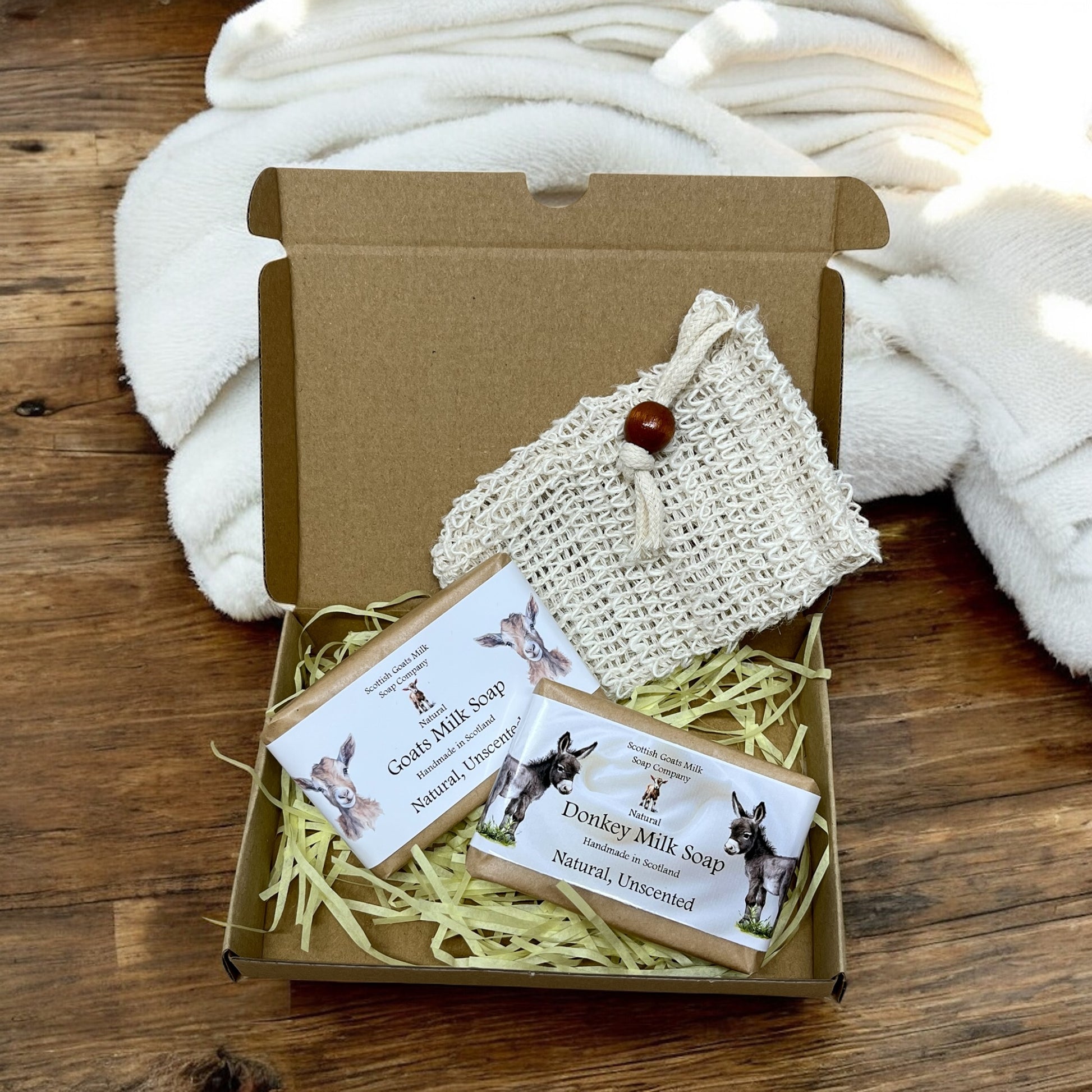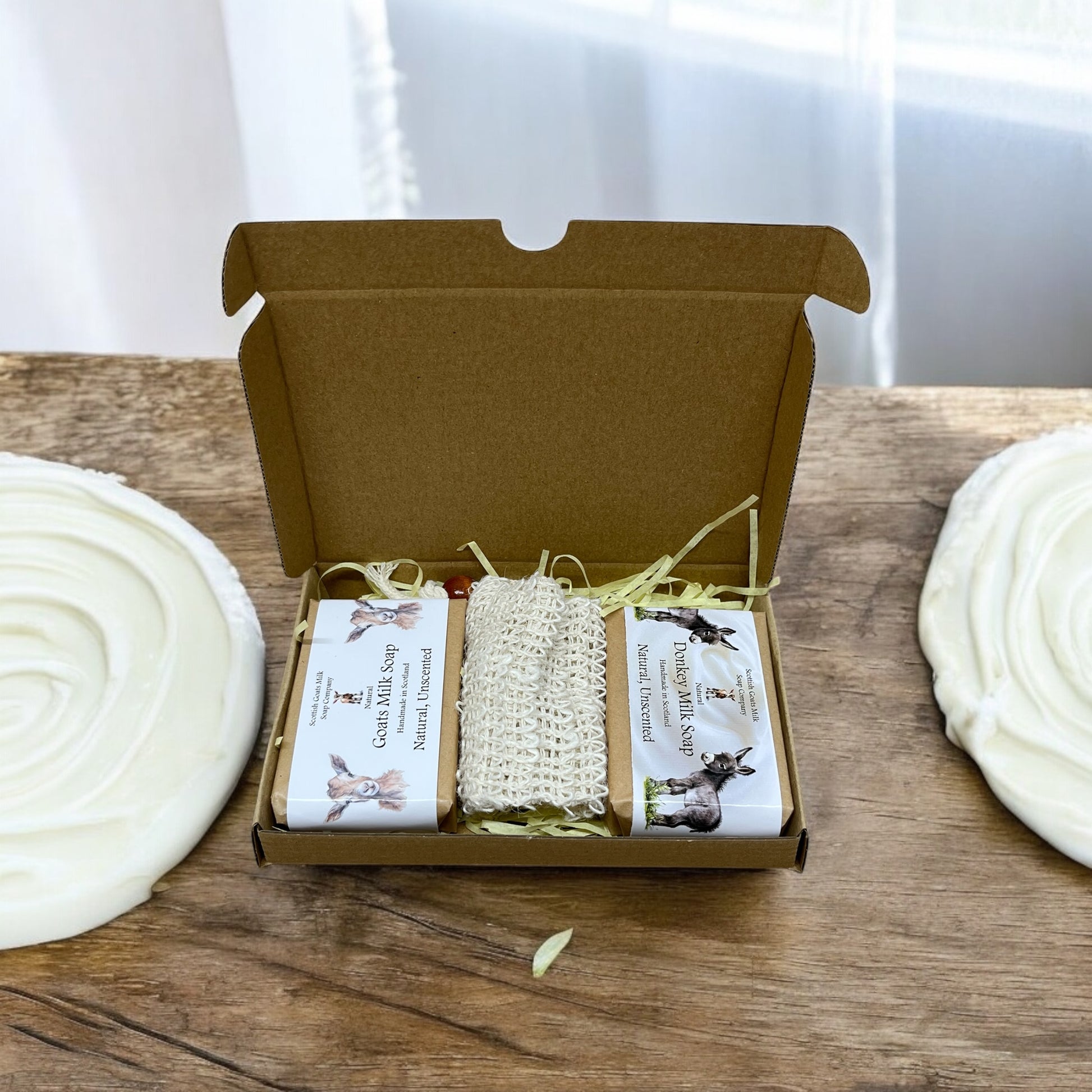 Our natural unscented goat and donkey milk soap gift boxes make a lovely treat for anyone.