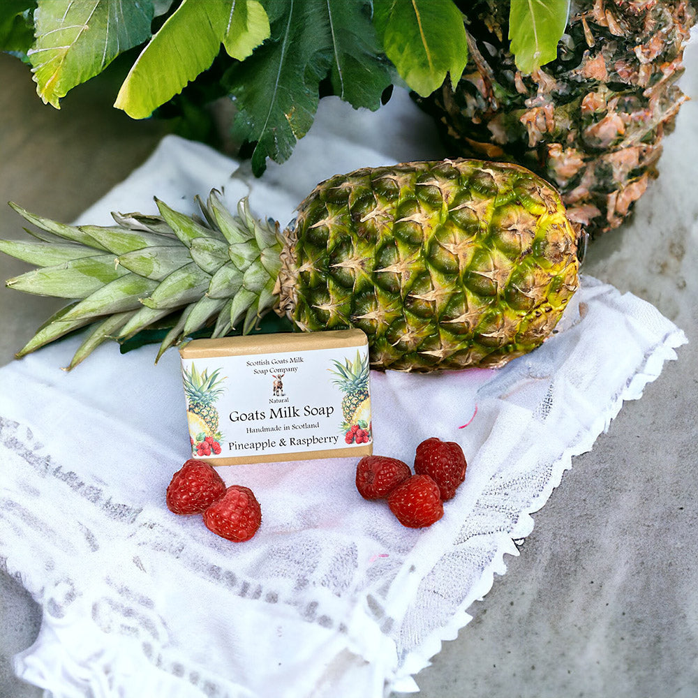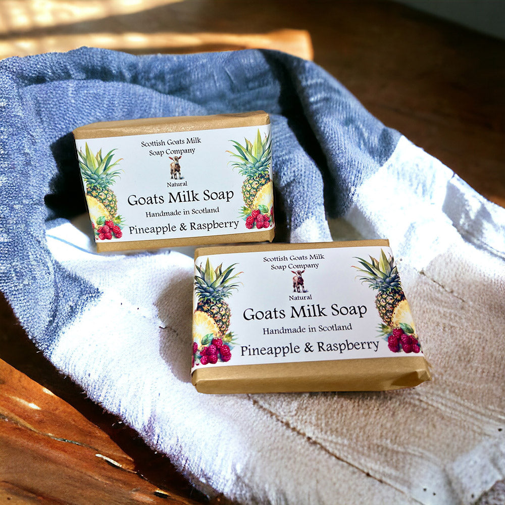 Our Pineapple and Raspberry scented natural goat's milk soap bars are a little piece of paradise. Handmade with care, these luxurious bars capture the essence of tropical bliss by blending the sweet tanginess of pineapple with the juicy tartness of raspberries, creating an irresistible aroma you won’t want to miss.