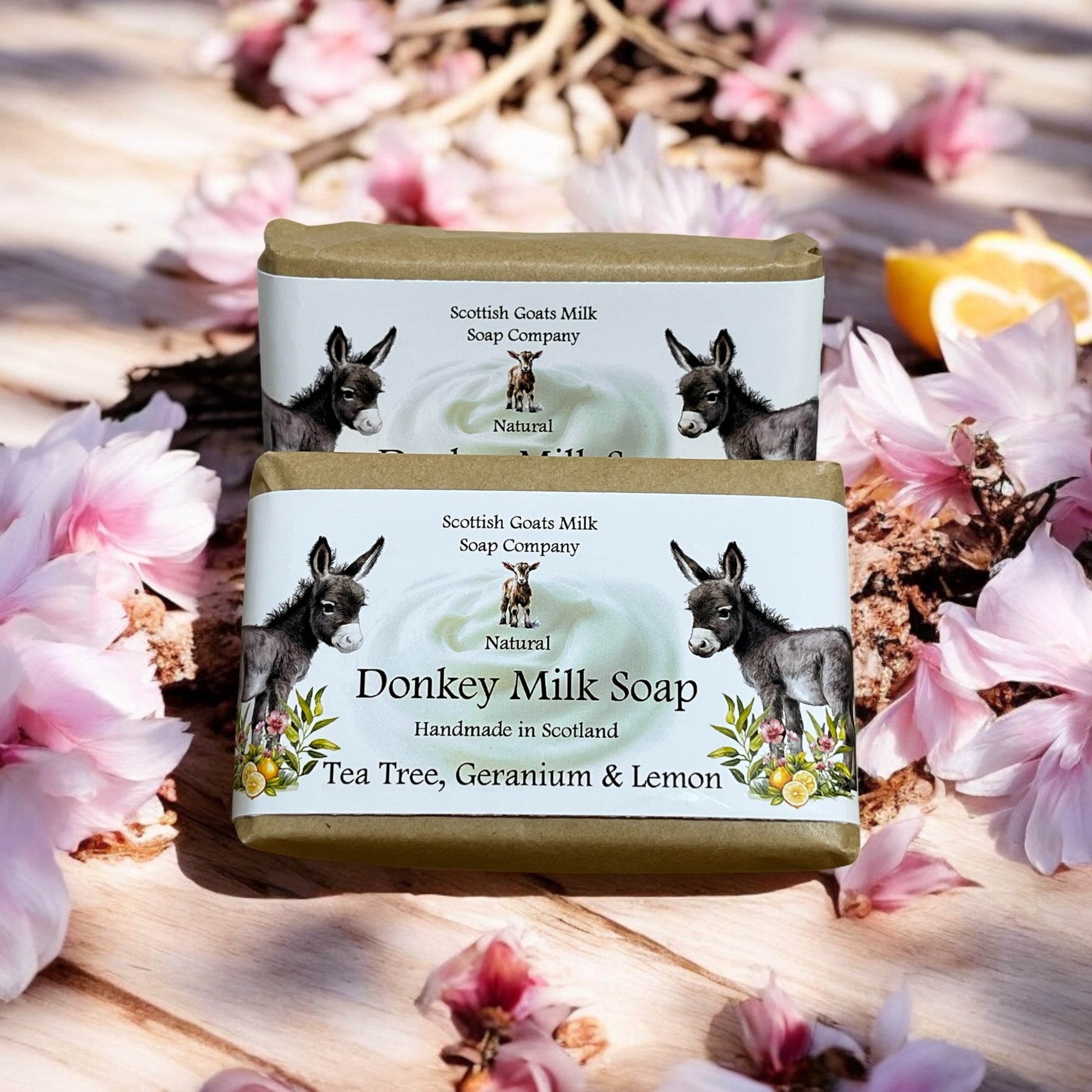 Our Donkey Milk Soap blended with Tea Tree, Geranium, and Lemon essential oils is a gentle yet powerful bar designed to care for even the most sensitive skin.